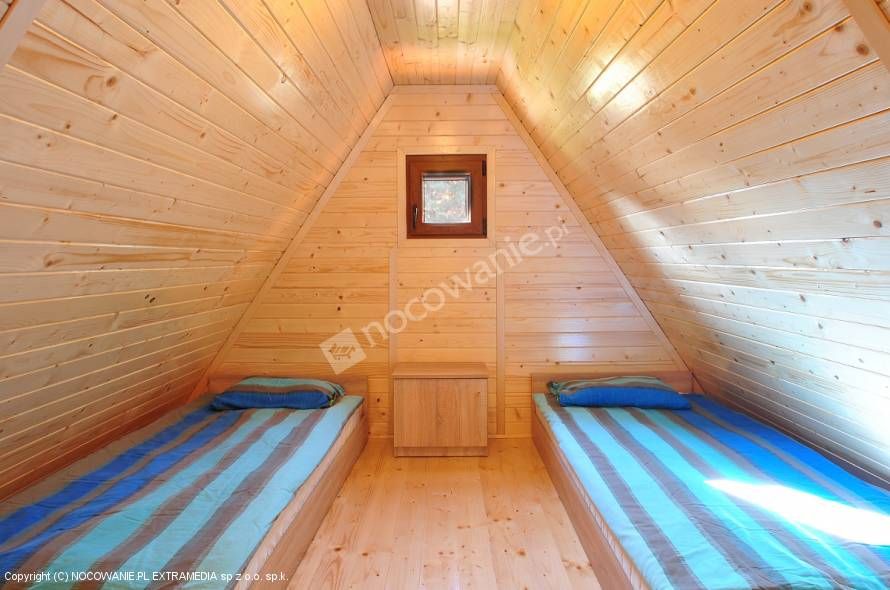 Piętro domku to dwie sypialnie, w jednej sypialni znajdują się dwa pojedyncze łóżka, które w razie potrzeby można połączyć w podwójne łoże małżeńskie, w drugiej sypialni łóżko podwójne.
