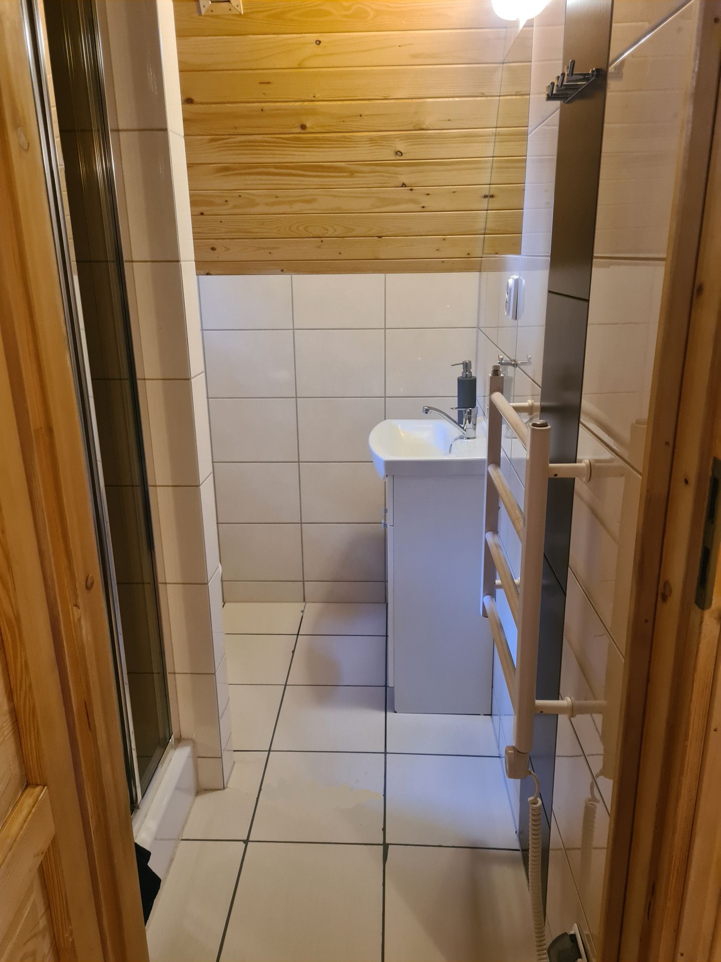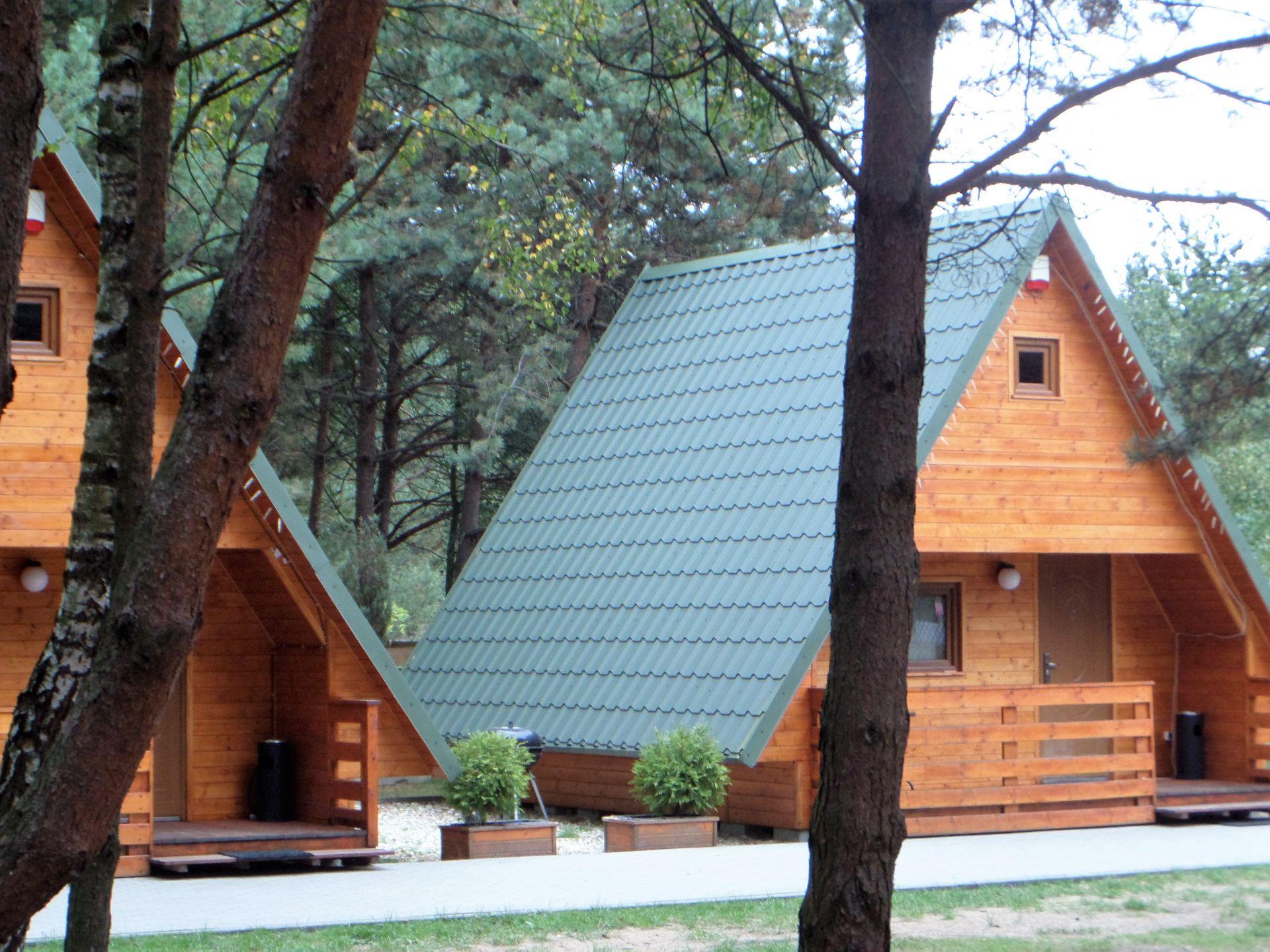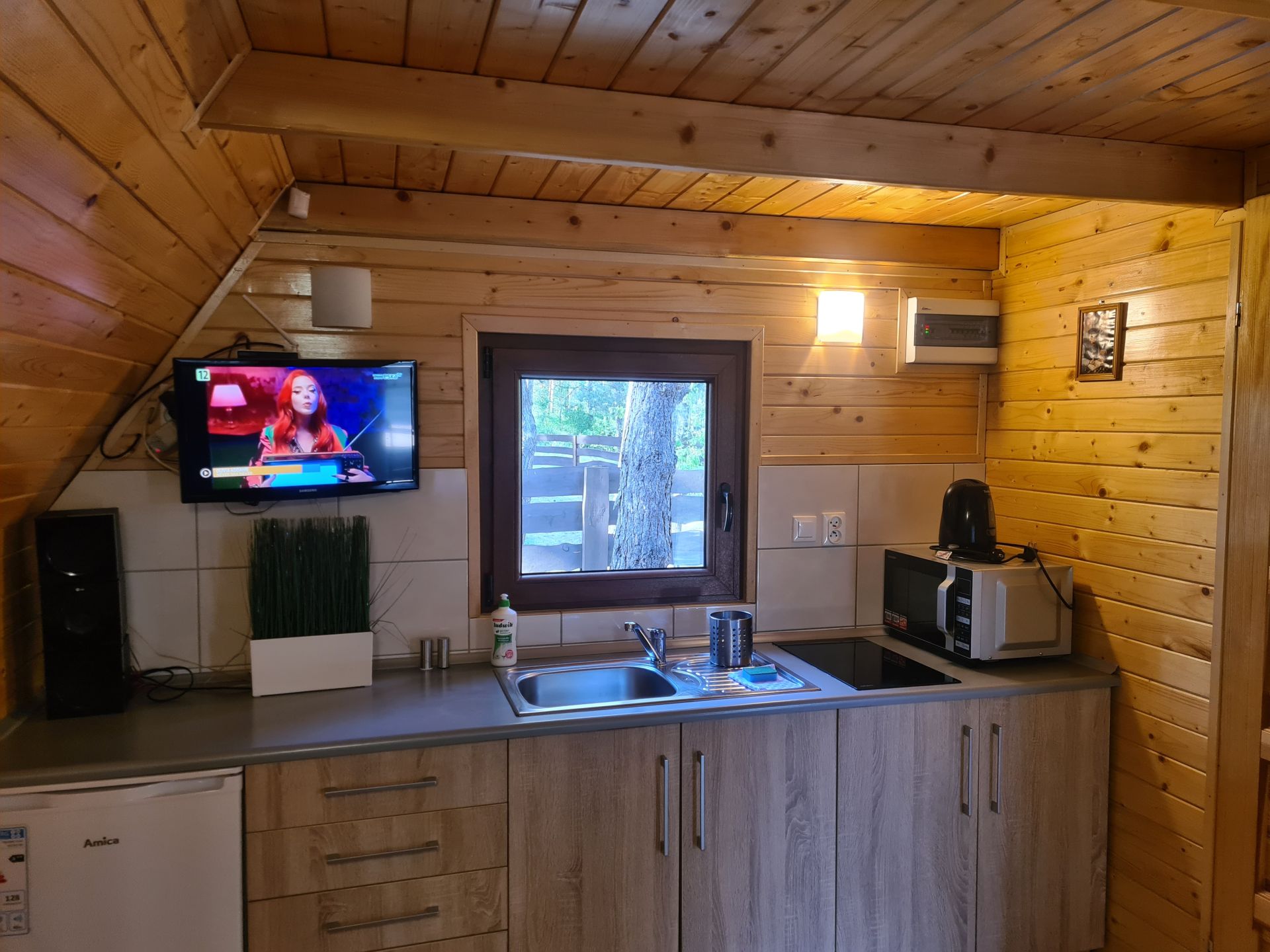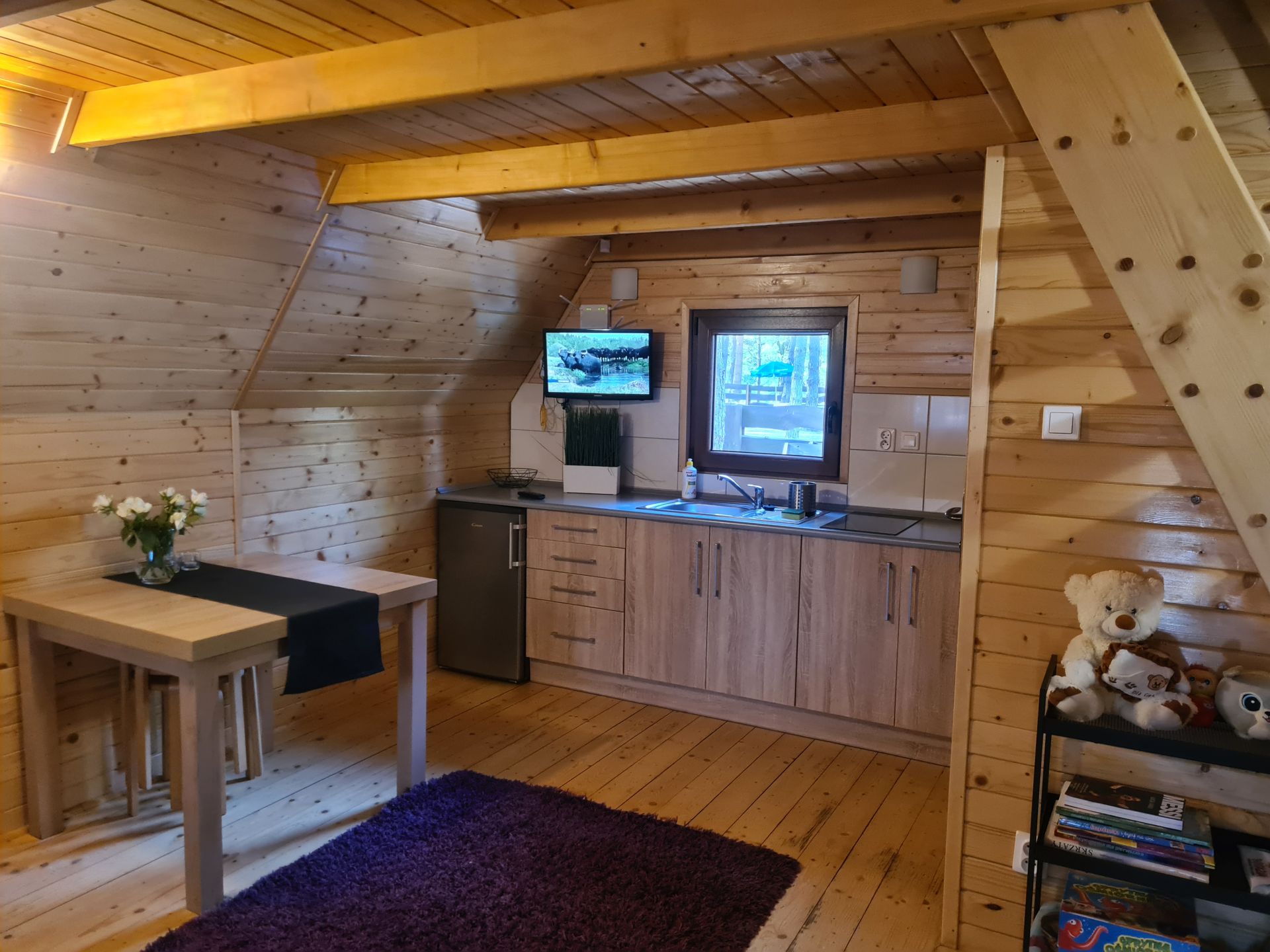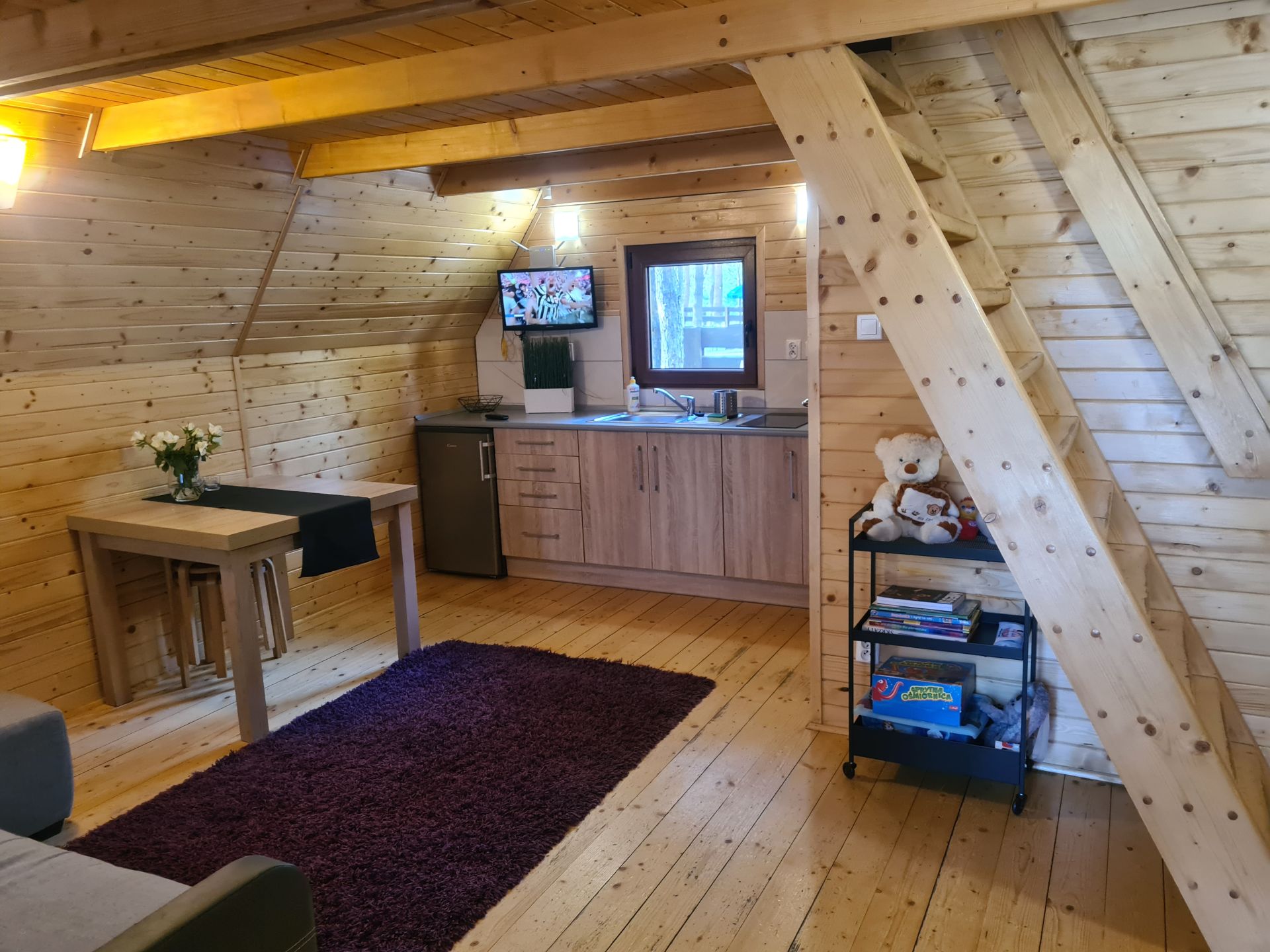 Domek ma powierzchnie 50m2. Na parterze znajduje się przestrzeń dzienna z aneksem kuchennym oraz wydzielona łazienka z prysznicem. Aneks kuchenny jest w wyposażony w płytę grzewczą, lodówkę, czajnik elektryczny, naczynia, garnki.
