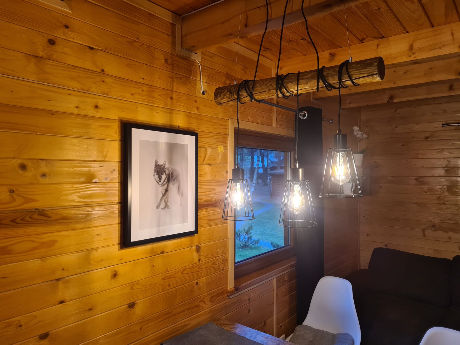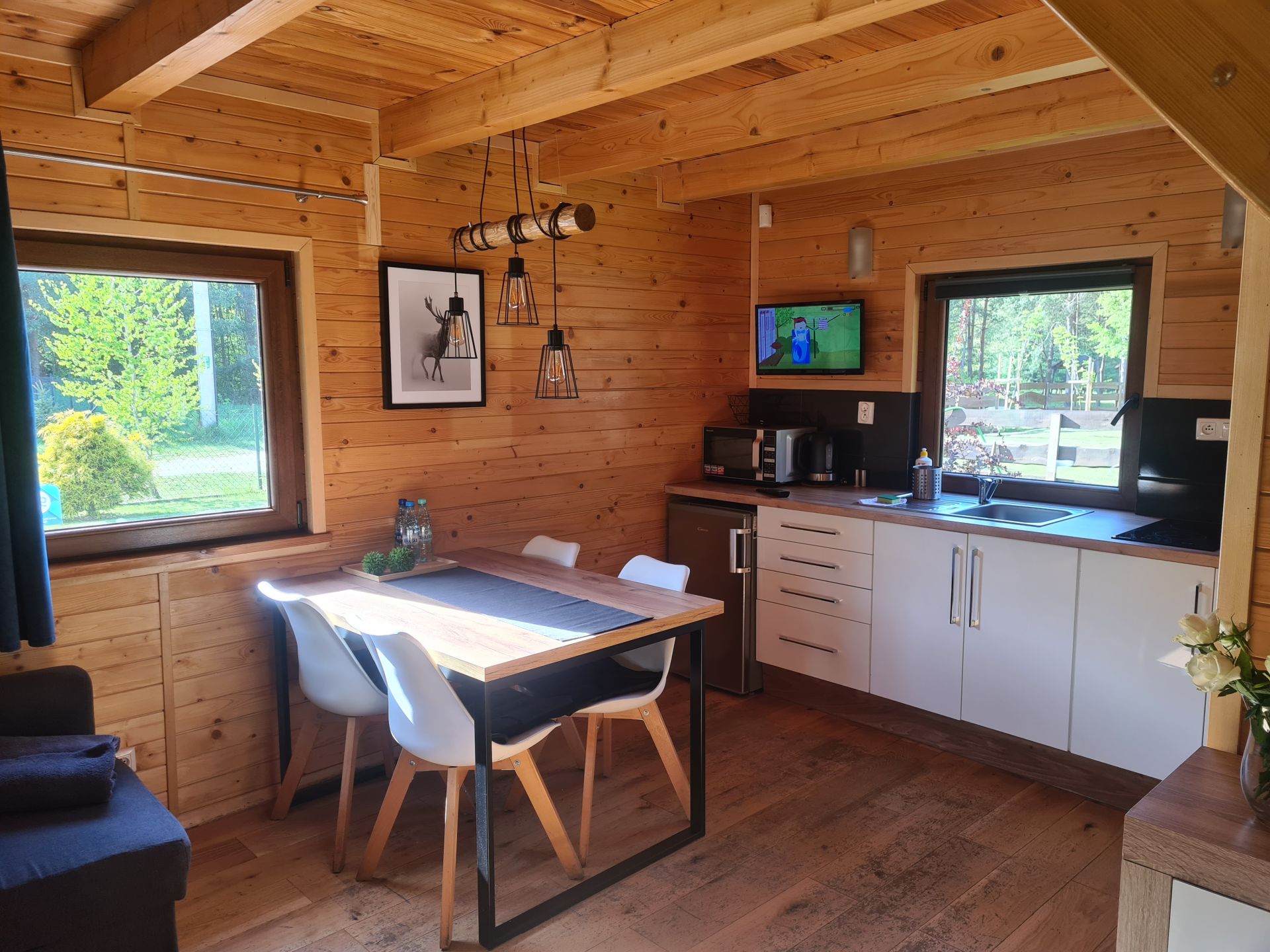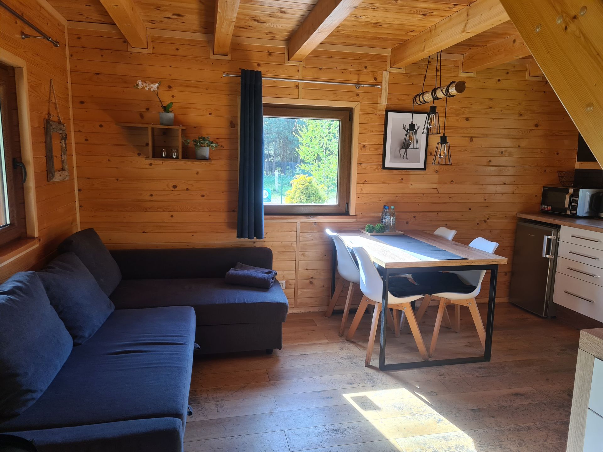 W części jadalnianej znajduje się stół z czterema krzesłami , w dziennej natomiast sofa rozkładana, stolik kawowy. Część dzienna wyposażona jest w TV z DVD. Z części dziennej jest bezpośrednie wyjście na taras i ogród. Domek posiada centralne ogrzewanie.