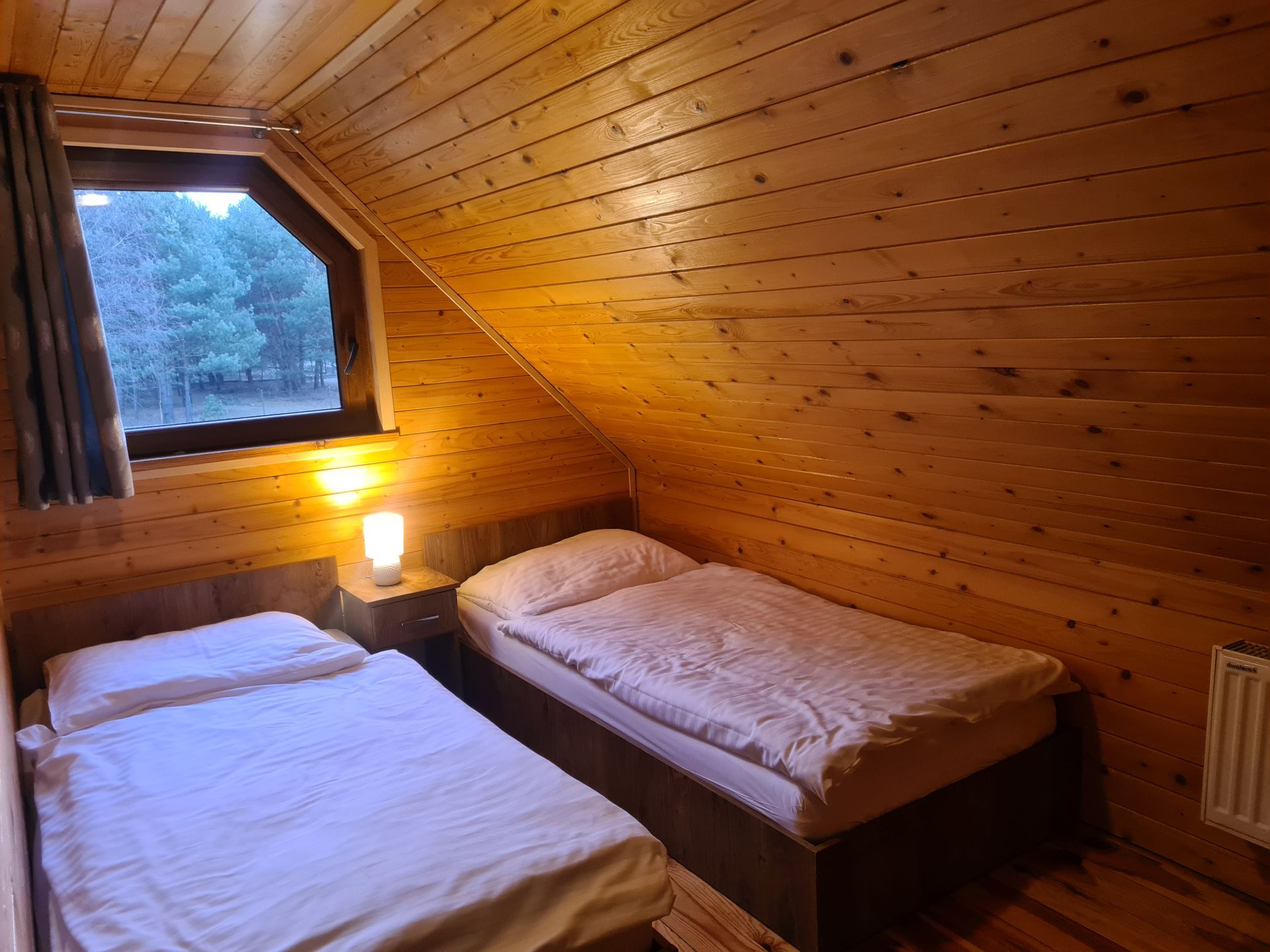 Piętro domku to trzy sypialnie, w każdej sypialni znajdują się dwa pojedyncze łóżka, które w razie potrzeby można połączyć w podwójne łoże małżeńskie